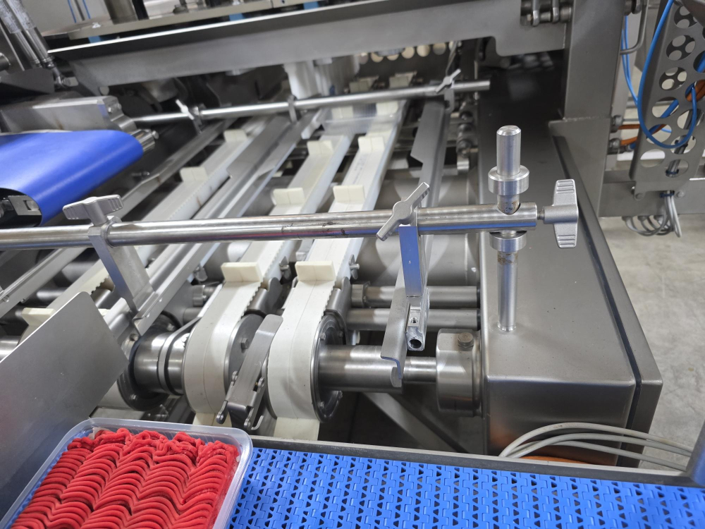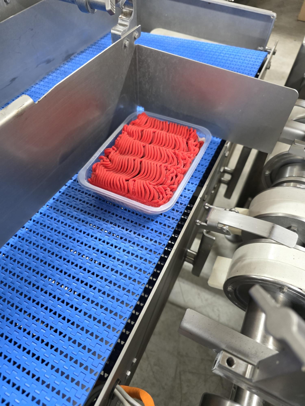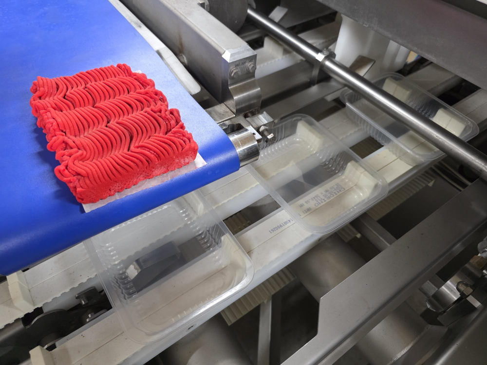 Vollautomatisches Ablegen von Burgern, Cevapcici, Hackbraten, Hackfleisch u.v.m. in Schalen.